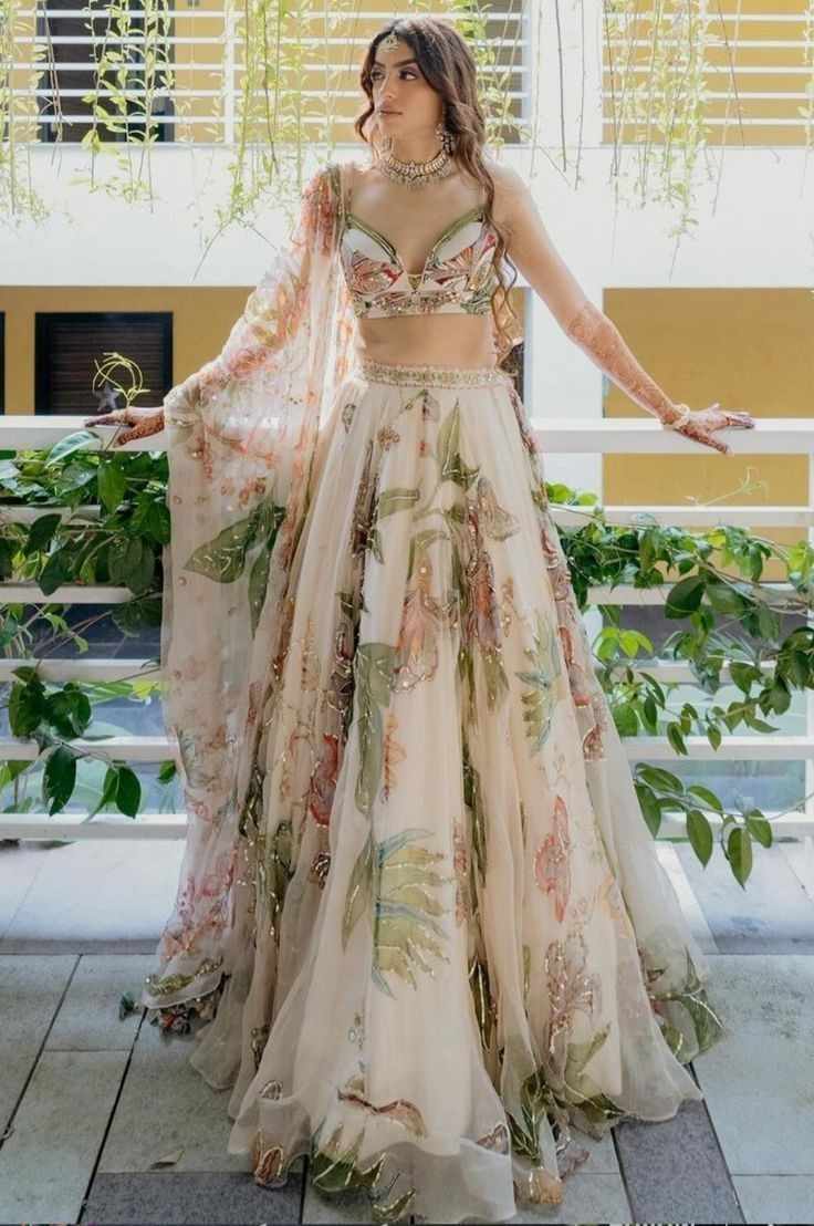 Fresh out of the shower, I stood in front of my mirror, towel-wrapped hair falling over my shoulders. My outfit for the evening was laid out—a lehenga in soft ivory beige, its base adorned with delicate pastel floral and leafy patterns in green, peach, and pink, all highlighted with subtle sequins and fine embroidery.